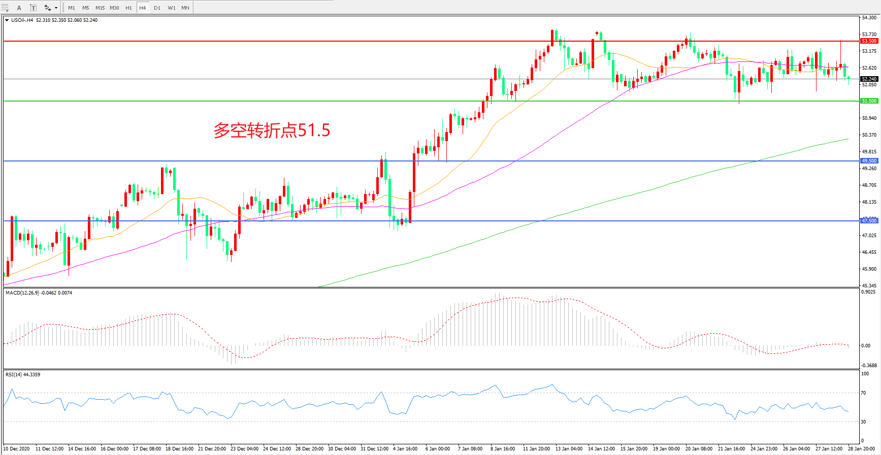 周四(1月28日),美国两党在环境努力方面仍然存在分歧,共和党议员们现在正联合起来反对拜登的气候议程,市场多空情绪交织,美国WTI原油冲高回落,收报52.24美元/桶。目前美股的走势也比较的脆弱,前一天大幅下行之后,昨天呈现冲高回落形态,宏观市场传递出了一种不安的信号。