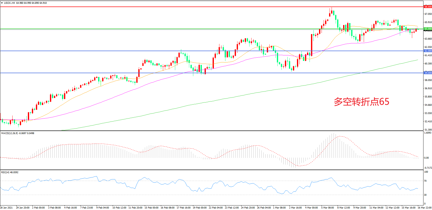 周三(3月17日)凌晨,根据美国石油协会公布的数据显示,美国当周API原油库存减少100万桶,好于市场预期,成品油库存表现也让人欣喜,汽油库存减少92.6万桶,精炼油库存小幅增加,数据公布后,美国WTI原油快速走高,收报64.98美元/桶。晚间22:30分,市场将迎来EIA原油库存数据,务必重点关注。