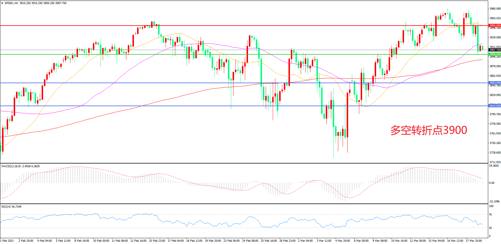 4小时图看,标普500高位震荡后长阴下破,上升趋势遭到破坏,3900成为短期支撑,3950成为上方阻力,MACD红柱减少,RSI指标走平,日内延续震荡概率较大。