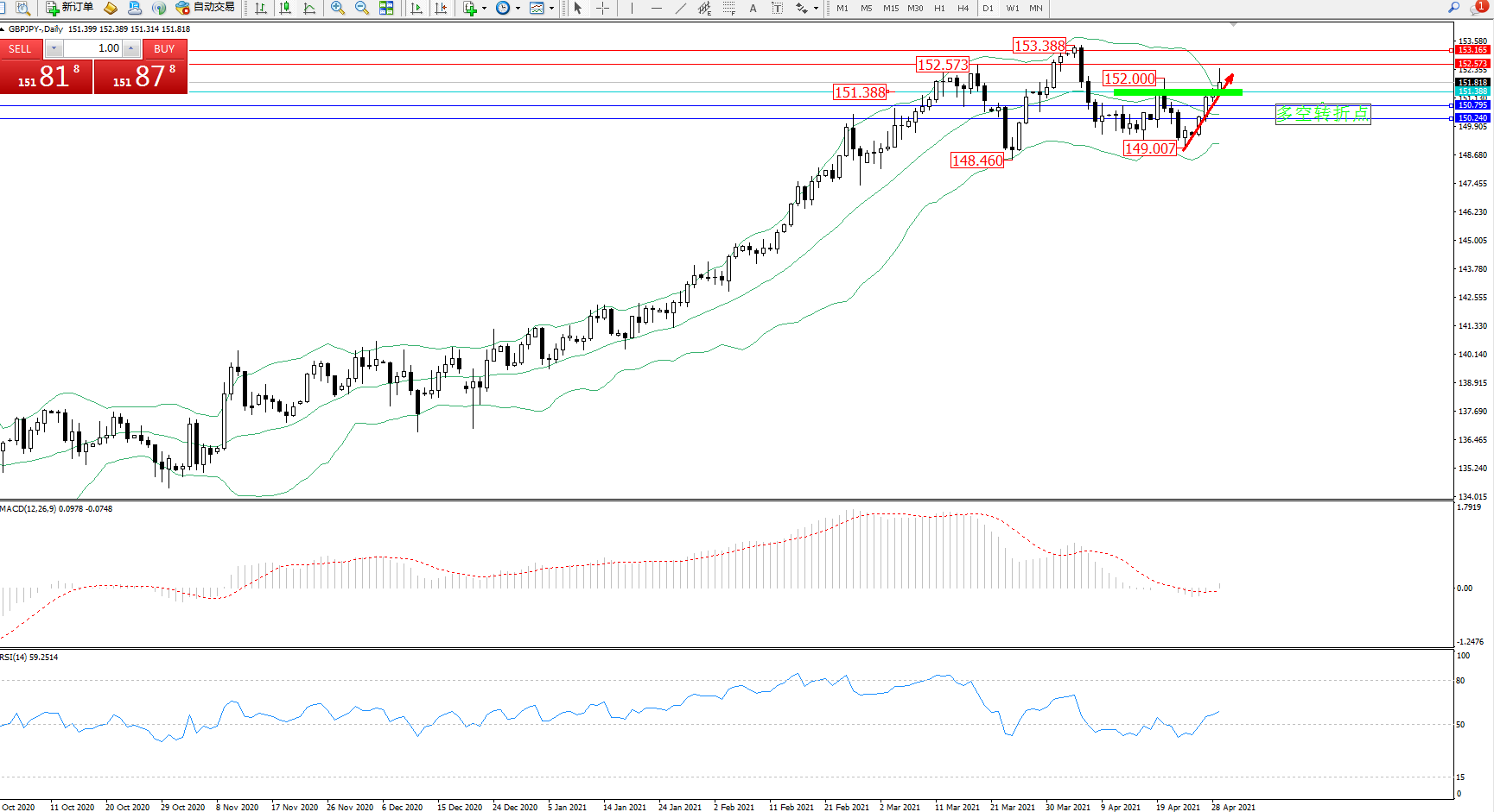 英镑兑日圆持续拉升至151.813附近震荡,美联储维持利率不变,且在购债规模以及对通胀发展的看法上均表态保守,令美元大幅走跌,如果英国能摆脱近期国内因脱欧后的一些政治负面影响、疫苗接种推进顺利、英央行在货币举措上不偏鸽派态度,英国经济正从新冠肺炎危机中大幅反弹。考虑到最近对实际国内生产总值(GDP)的向上修正,对2021年的预测达到了惊人的7.8%,高于对美国的预期(高盛预测美国经济将增长7.2%),也大大高于市场预期的5.5%。由于英国是去年七国集团中表现最差的经济体,经济萎缩了9.8%,这一转变就更加令人惊讶了。4月,衡量制造业未来趋势的英国采购经理人指数预览值(PMI)远强于预期,其中服务业PMI进一步强劲进入扩张区域。