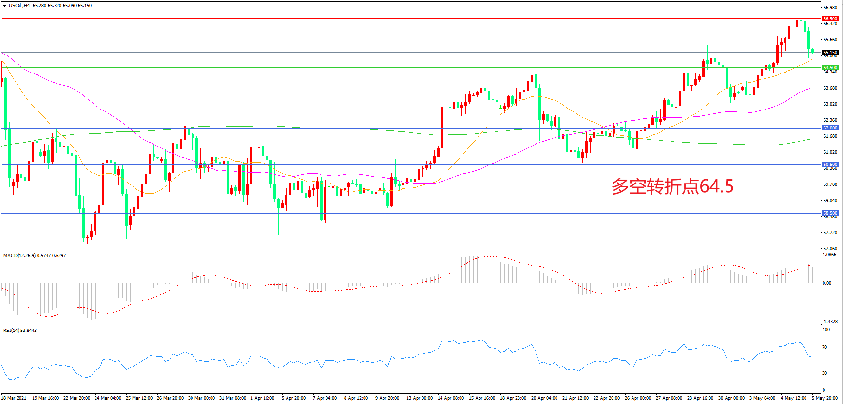 周三(5月5日),美国当周EIA原油库存减少799万桶,远超市场预期,但疫情反复造成的需求前景担忧依然让多头迟迟不敢发起向上的冲击,美国WTI原油先涨后跌,收报65.20美元/桶。近期印度新冠疫情感染和死亡人数持续以惊人速度增加,连续13天单日新增病例超过30万例,作为世界第三大原油消费国,印度疫情的严峻形势给油价带来了一定压力。