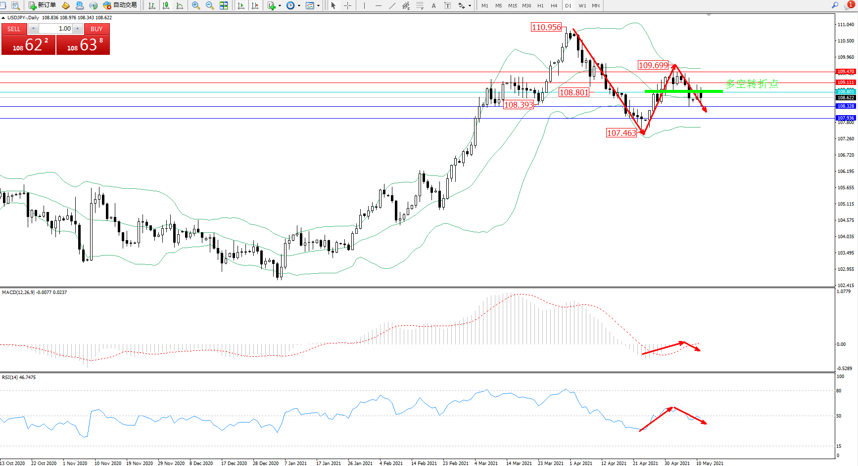 技术点评:高位空头动力延续空头下行走势持续下挫,触及布林带指标下轨附近节点后不断向下移动,空头动力下行至107.463附近得到支撑短暂整理后急速回升,突破中轨触及上轨附近后遇阻维持震荡再度下挫,破中轨附近持续震荡,布林带指标呈张口走势后开始缓慢收口中,MACD指标处于0轴线下方空头区域持续震荡后开始有回升迹象,RSI指标处于空头区域整理后急速反转上行,在50均衡线节点附近弱势震荡;