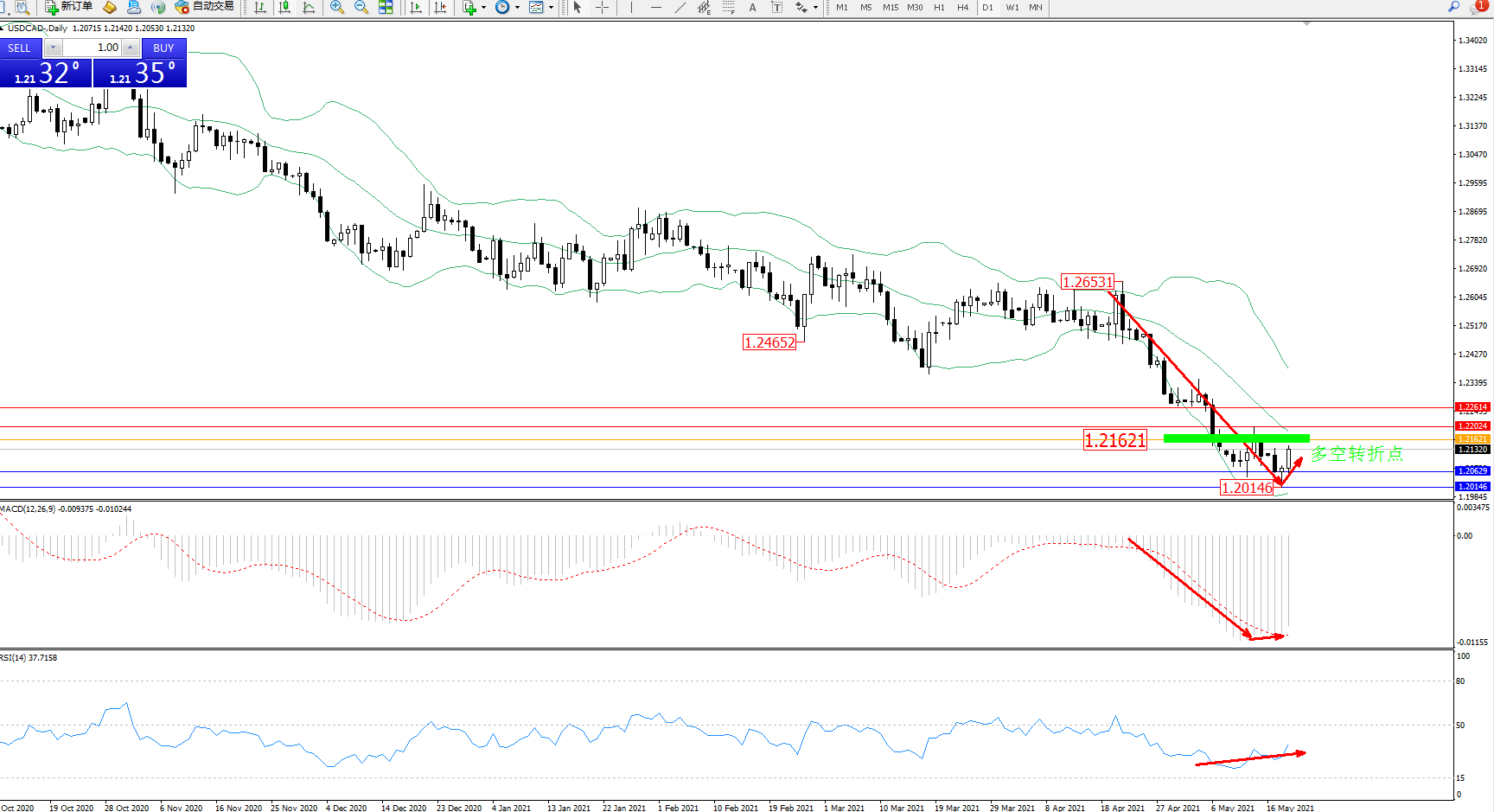美元兑加元处于低位1.21320附近震荡,加元持续上涨将危及加拿大央行最新的预估,无论如何,美元持续反弹看起来仍遥遥无期,关键的40周移动均线位于1.2802,在突破这些水平之前,固有的大趋势将保持对加元有利;隔夜指数掉期(OIS)市场目前预计,加拿大央行将在未来两年内分三次加息,加息幅度为25个基点,将使加元2年期政府债券收益率高于美国国债收益率,加拿大央行已经对强势加元打击出口表达关切,但分析师多表示,大宗商品需求高涨以及消费支出即将反弹料淡化加元升值效应。加元走强通常会不利于加拿大出口商的全球竞争,同时也会降低加拿大的商业投资吸引力。加拿大央行在4月预估中假设加元将维持在0.80美元附近,并称加元走强可能冲击出口预估。
