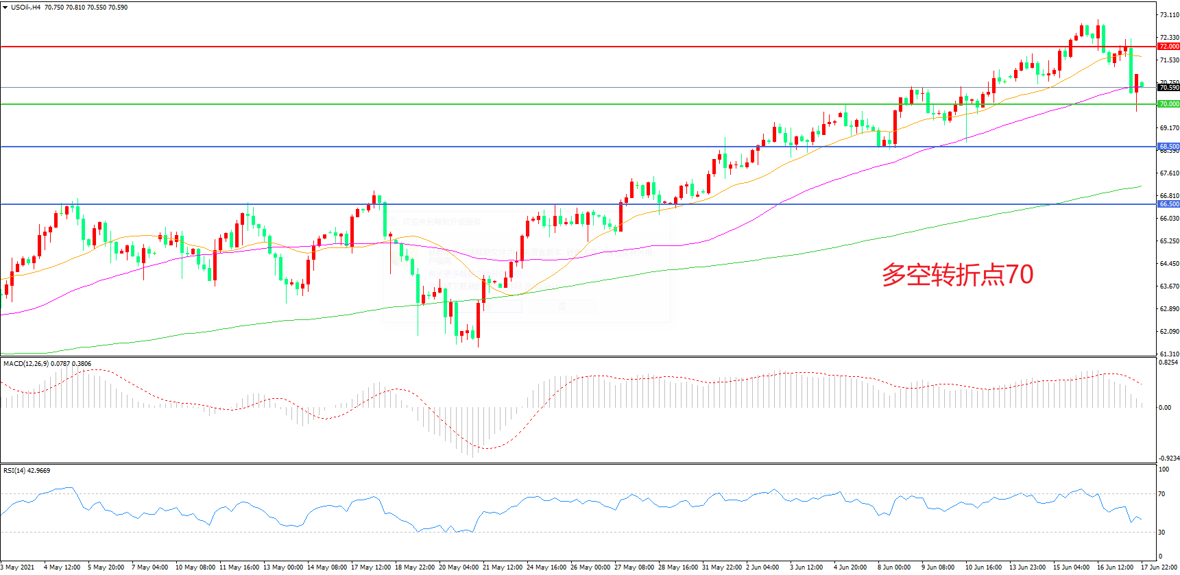 周四(6月17日),在美联储鹰派发声和中国抛储消息得到官方确认后,持续走弱的商品市场跌幅进一步扩大,美国WTI原油连续两日下跌,收报70.66美元/桶。美指短期的强势表现让油价再次承压,但从中期来看,在供给端没有明显增加的情况下,油价自身的基本面仍然会比较强,飙升的需求和有限的供应将推动油价继续走高。