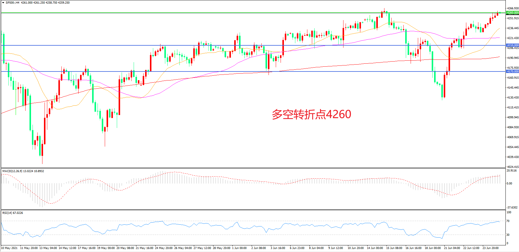 周四(6月24日),拜登宣布白宫和两党参议员达成基建协议,协议计划八年内共投入1.2万亿美元,美股迎利好,标普500在金融和能源板块带领下走高,11大板块中,仅公用事业和房地产两个收跌,收报4260点。近期金融板块一扫上周以来的颓势,迎来强势反弹,投资者或许已经开始消化美联储的紧缩信号,修正悲观预期,标普500延续上行可能较大。
