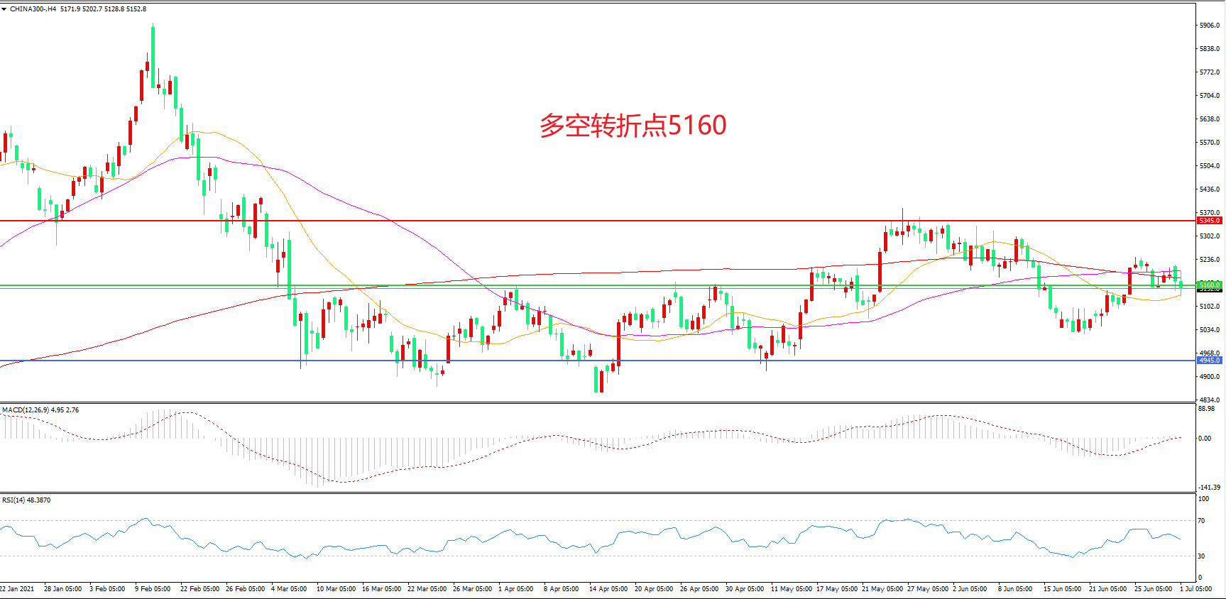 4小时图看,沪深300延续低位震荡形态,整体波幅不大,21周期均线成为下方支撑,5160成为多空分水岭,MACD绿柱缩短,RSI指标走平,日内延续震荡概率较大。
