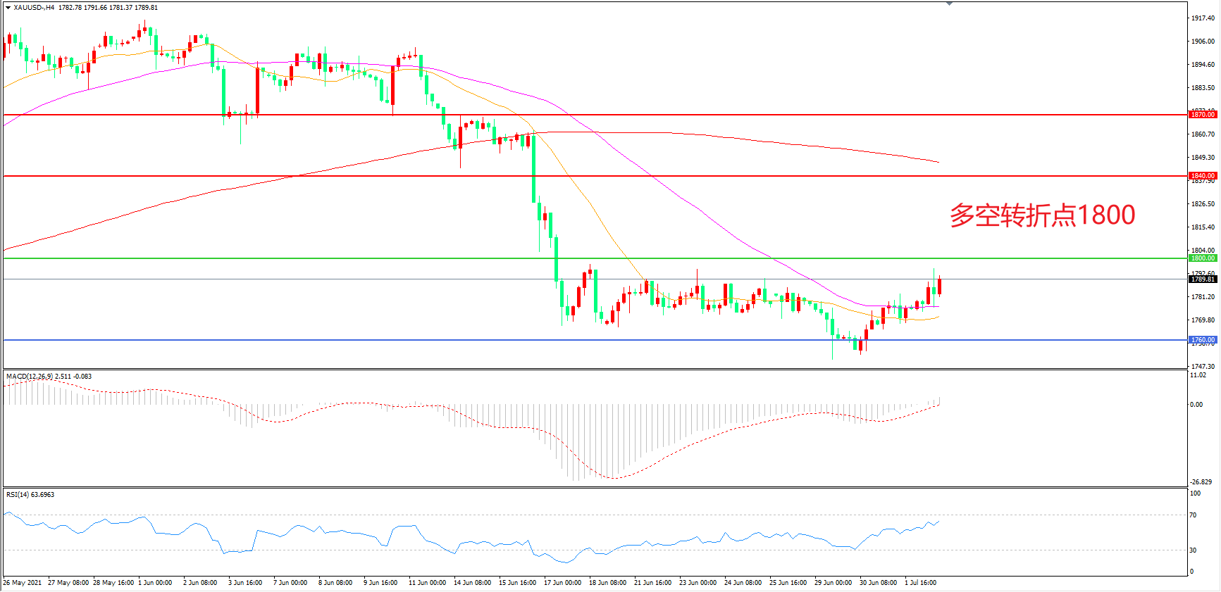 上周五(7月2日),美国6月非农新增就业人数增长85.0万人,远超市场预期,但失业率意外不降反升让市场认为美联储不会急于迅速撤除宽松,现货黄金一度上触1790美元/盎司后小幅回落,收报1789.81美元/盎司。但考虑到美联储最近的鹰派倾向,很难对黄金有强劲的看涨理由,越来越多迹象显示,美国将早于预期加息,且在此之前缩减购债规模,这应会给金价带来更多下行压力,强劲的就业市场可能成为美联储”收水”的催化剂。