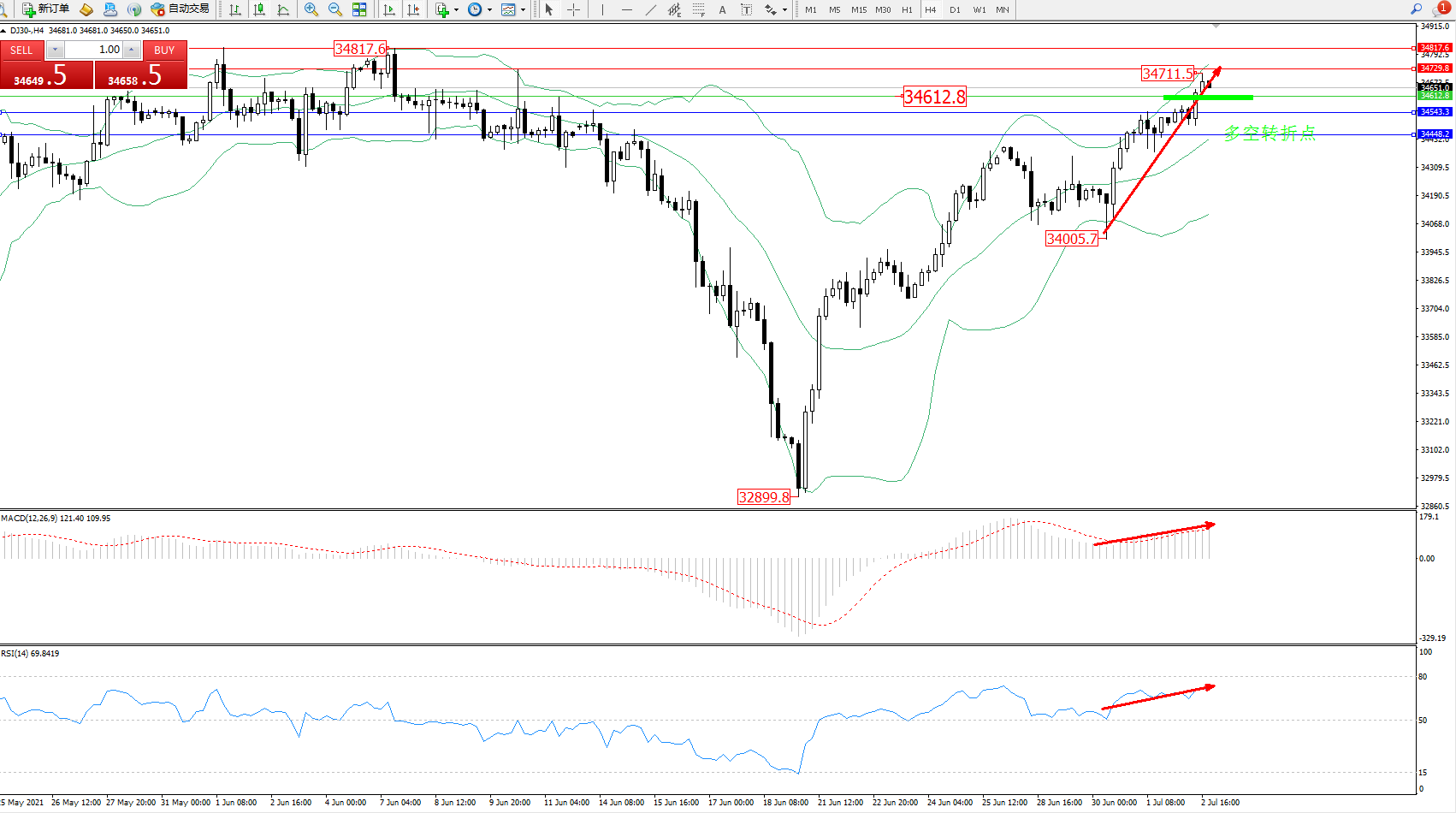 技术点评:多头动力延续布林带指标上轨附近持续拉升上扬,高位抵达34711位置后短短暂遇阻,多头动力有继续拉升态势,前期高位34817位置近在咫尺,破位在即,布林带指标呈上行趋势通道走势持续中,MACD指标处于处于0轴线上方多头区域维持整理平移中,RSI指标处于多头区域高位维持整理中;