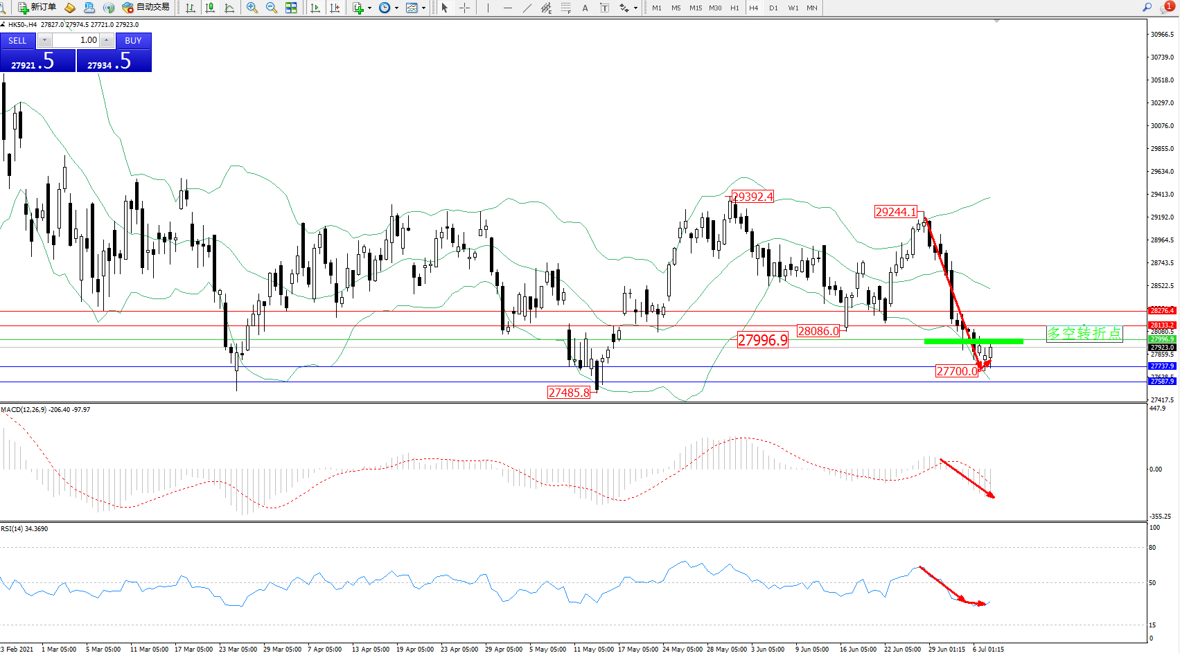 技术点评:高位空头动力急速下挫至布林带指标下轨附近持续震荡向下移动,低位抵达27700位置后出现短暂回升走势,但下行趋势走势依旧存在,布林带指标呈张口走势持续中,MACD指标空头动力处于0轴线下方空头区域维持整理下行中,RSI指标处于50均衡线下方空头区域持续下探中;