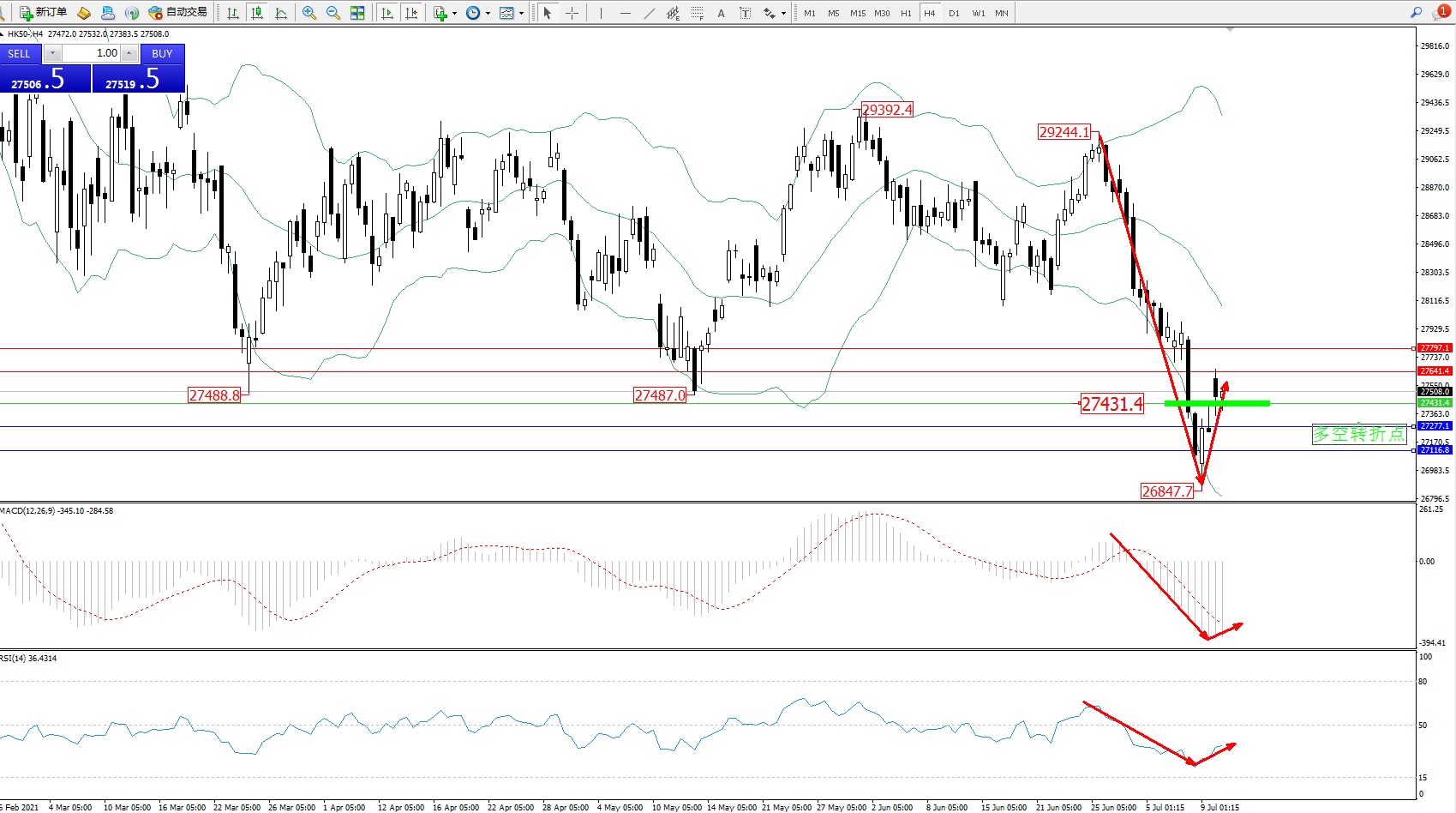 技术点评:空头动力延续布林带指标下轨附近持续下挫,低位抵达26847位置后强势反转上扬,下行趋势短期回升后震荡,布林带指标开始有收口迹象,MACD指标处于空头区域低位开始整理,RSI指标处于空头区域低位开始整理缓慢上移;