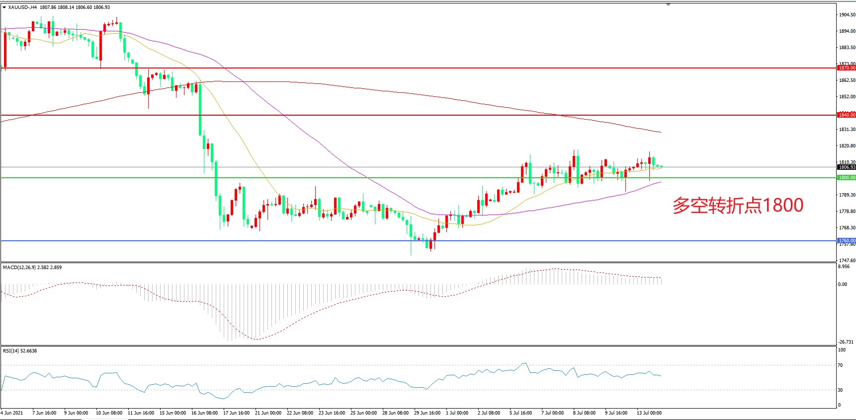 周二(7月13日),美国通胀“高烧”不退,6月CPI超预期增长,创2008年8月来最大增幅,现货黄金在数据公布之初迅速回落,但之后震荡反弹,收报1807.83美元/盎司。目前市场关注美联储主席鲍威尔周三和周四在国会的证词,以了解美联储最终将缩减资产购买规模的任何暗示,如果鲍威尔发言涉及货币政策的重要信息,金价可能随时开启上涨行情。