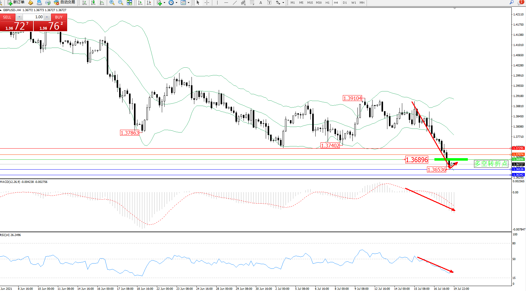 交易策略:1.36896下方看跌,目标1.36536、1.36342