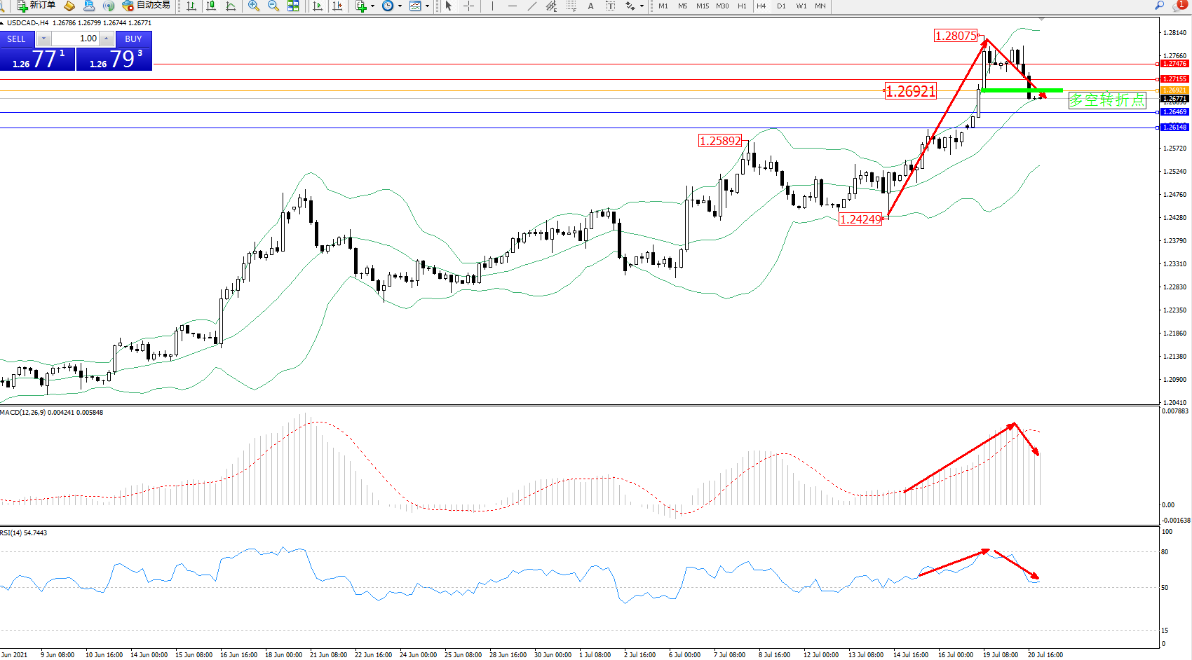 技术点评:多头动力延续布林带指标上轨附近持续震荡上扬,高位抵达1.28075位置后遇阻开始整理回撤,触及中轨附近节点后短暂震荡,有继续向下回调走势迹象,布林带指标呈收口走势后有平移迹象,MACD指标处于多头区域高位震荡上扬后反转回撤,RSI指标处于多头区域高位整理后急速回撤下行;