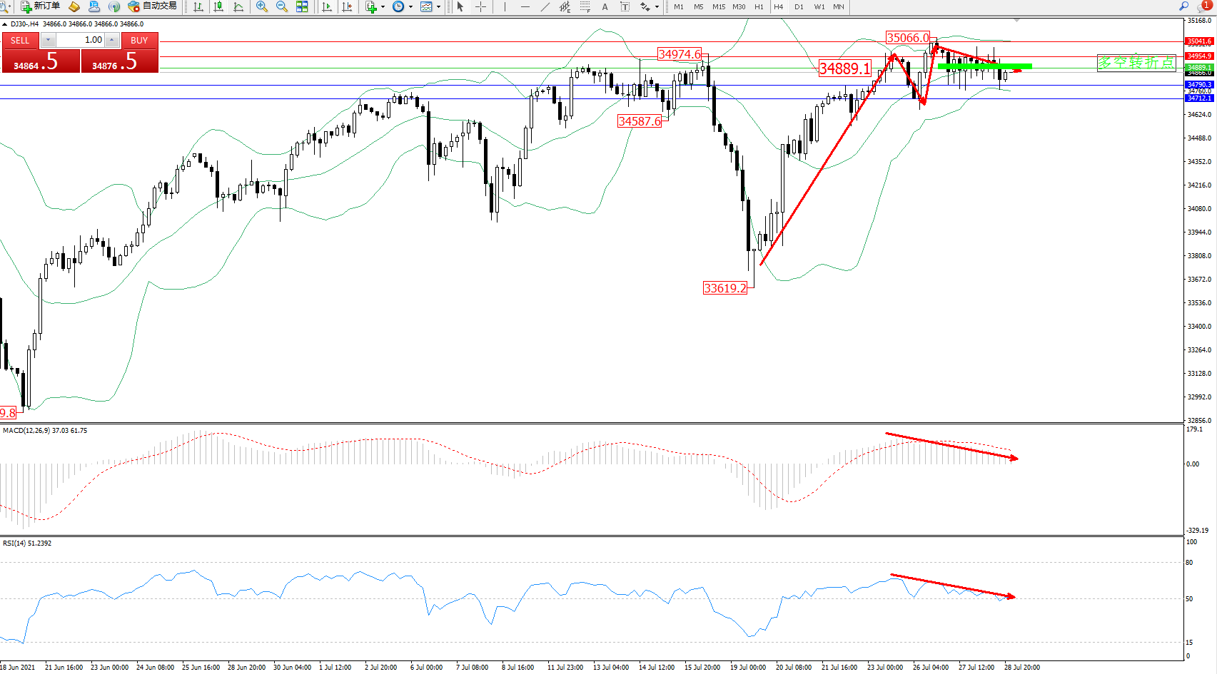 技术点评:多头动力延续布林带指标通道中上轨区间持续震荡上扬后,高位波幅空间逐渐收窄,布林带指标呈收口走势持续中,高位35006附近压制短期存在,MACD指标处于0轴线上方多头区域维持整理向下移动,RSI指标处于50均衡线附近弱势震荡平移中;