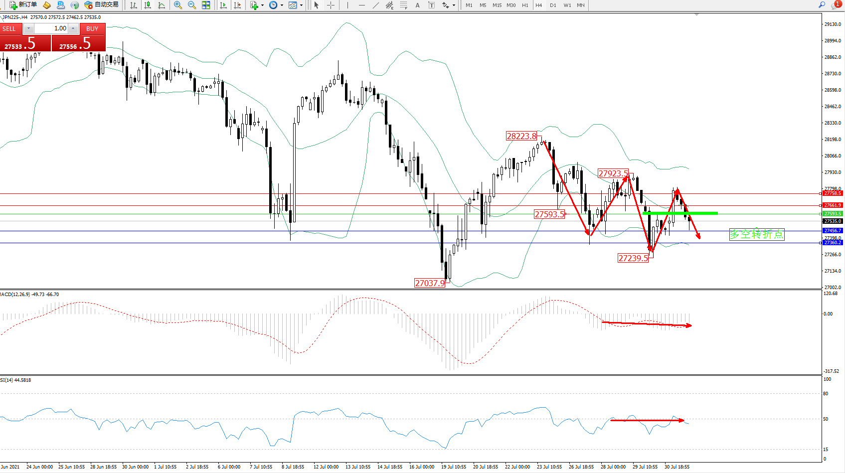 技术点评:空头动力呈阶梯式震荡向下移动,低位抵达27239位置后反转上移,短期回升至中轨上方震荡后再度下行,纠结于中下轨区间震荡,布林带指标呈下行趋势走势持续中,MACD指标处于0轴线下方空头区域维持整理平移,RSI指标处于50均衡线附近震荡;