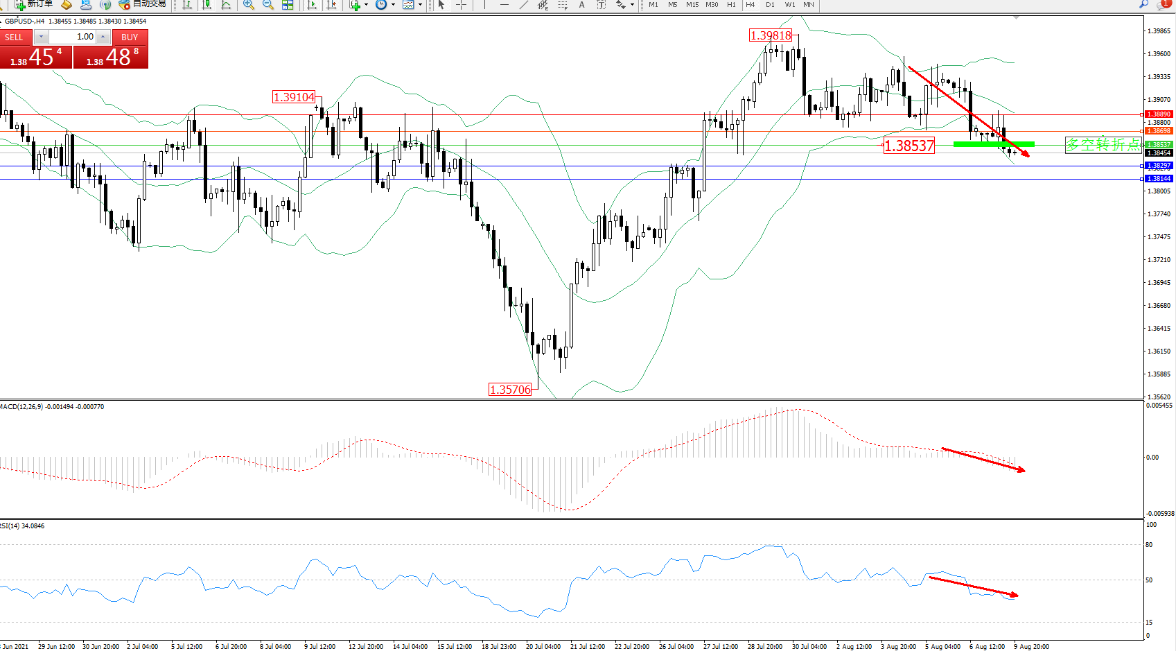 交易策略:1.38537下方看跌,目标1.38297、1.38144