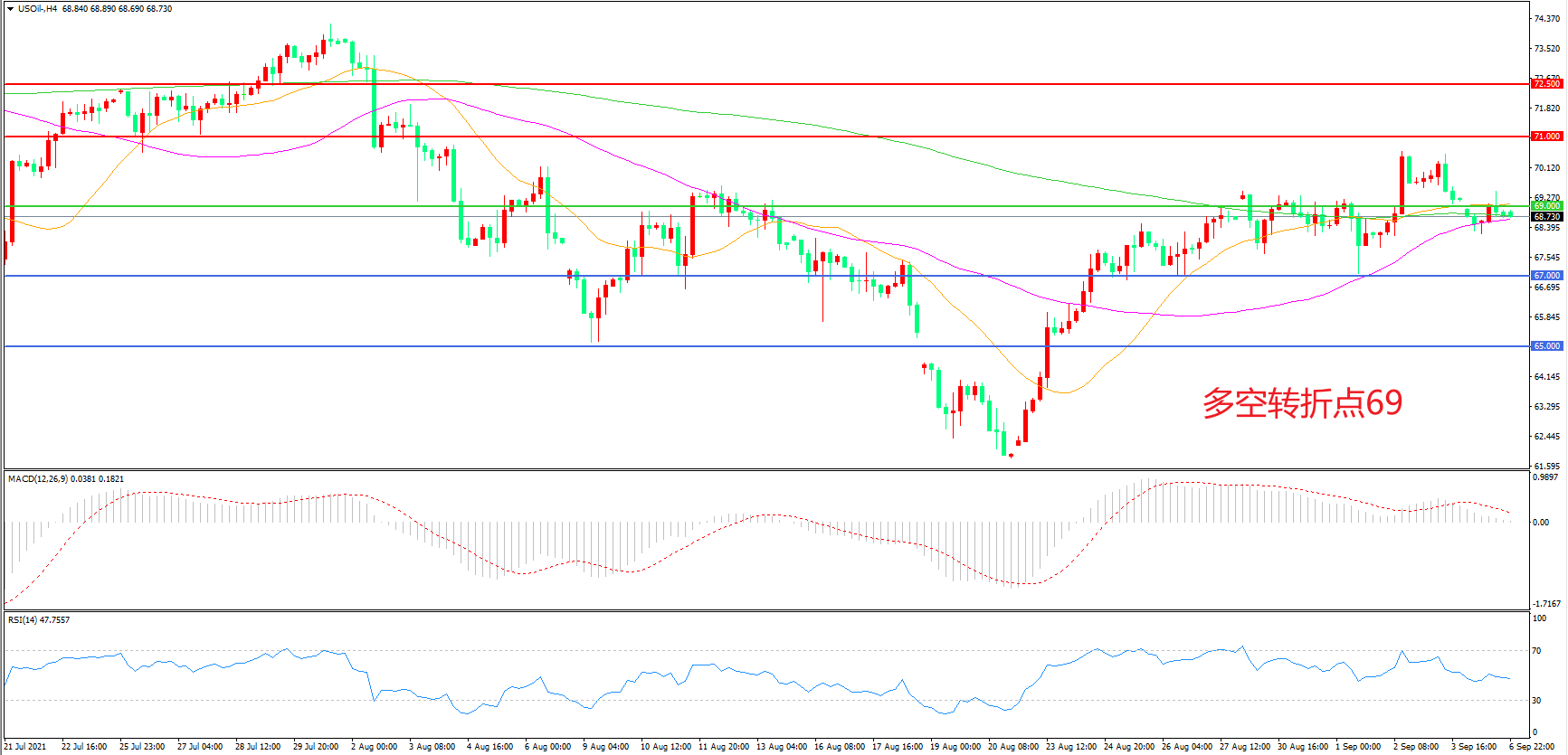 4小时图看,油价以55周期均线为依托窄幅震荡,69美元成为多空分水岭,MACD红柱缩短,RSI指标走平,日内震荡上行概率较大。