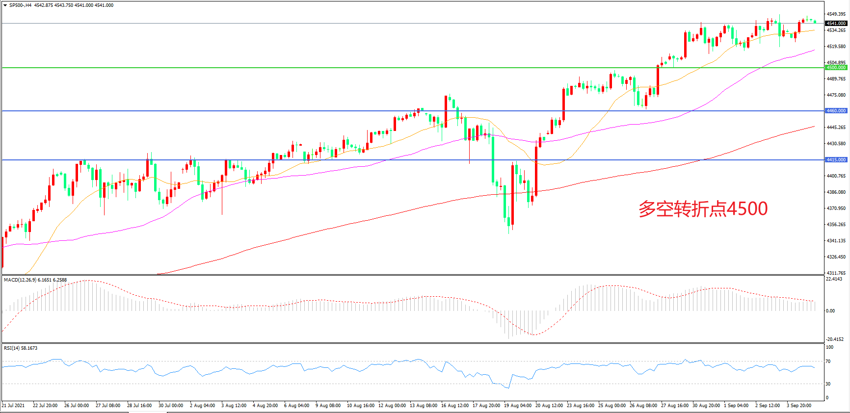 4小时图看,标普500高位震荡迹象明显,21周均线成为短线支撑,4500成为短期多空分水岭,MACD红柱增加,RSI指标走平,日内震荡上行概率较大。