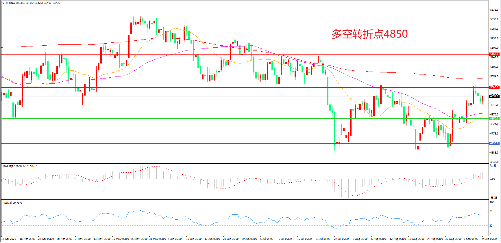 4小时图看,沪深300冲高回落后呈现宽幅震荡形态,5000点成为短期阻力,均线系统成为下方支撑,MACD红柱增加,RSI指标走平,日内震荡上行概率较大。