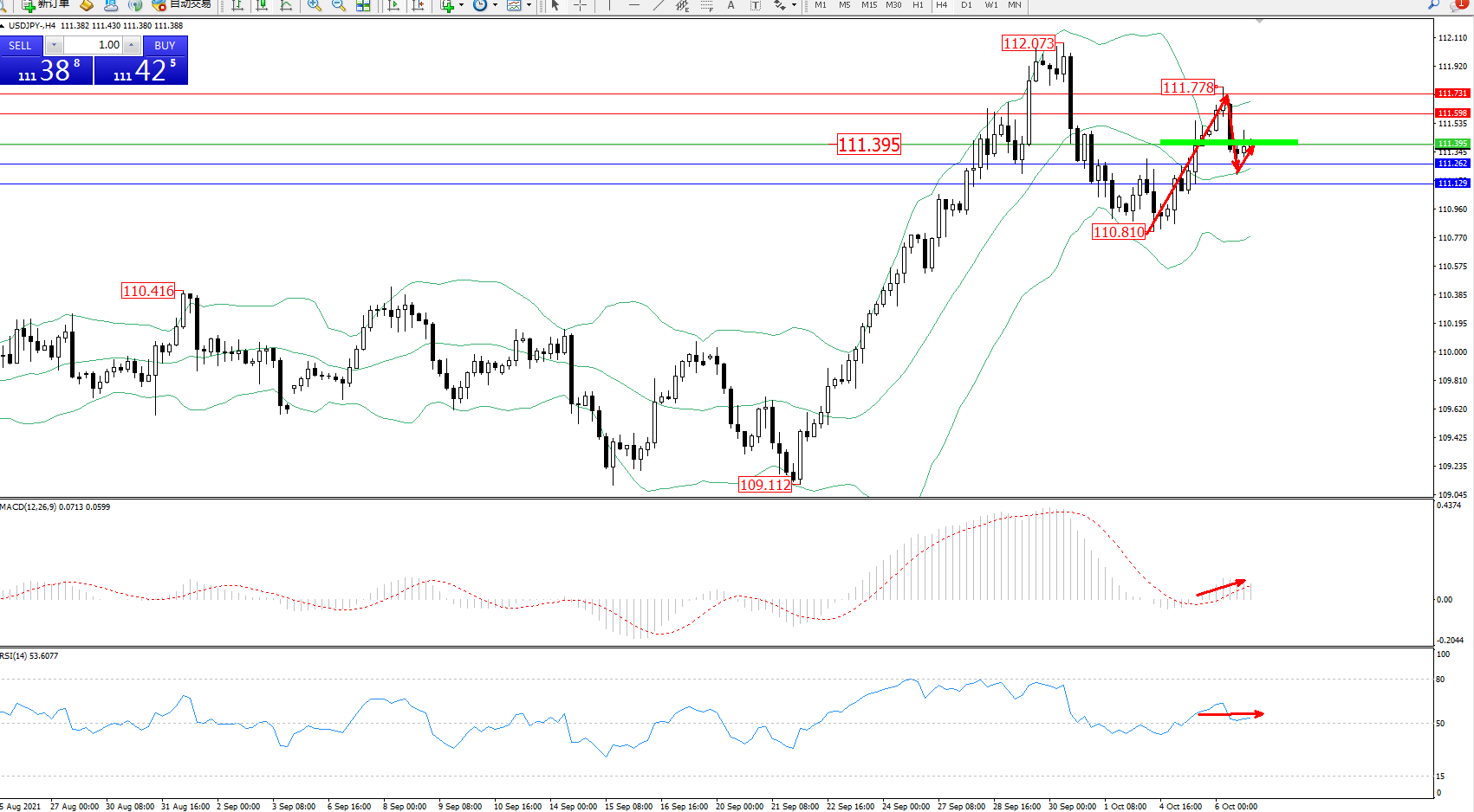 技术点评:多头动力持续震荡上扬,高位抵达111.778位置后遇阻回撤,纠结于布林带指标通道中上轨区间维持窄幅整理中,布林带指标呈缓慢张口走势持续中,MACD指标处于0轴线上方多头区域维持整理平移,RSI指标处于50均衡线上方维持弱势徘徊中;