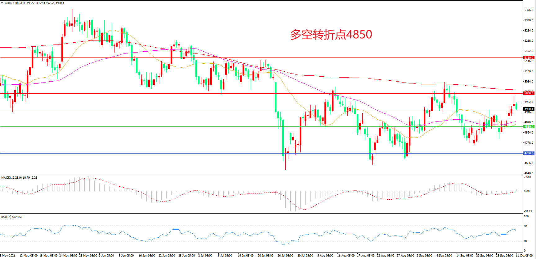 4小时图看,沪深300冲高回落,短期表现受阻于200周期均线,55周期均线成为下方支撑,MACD红柱缩短,日内延续区间震荡概率较大。