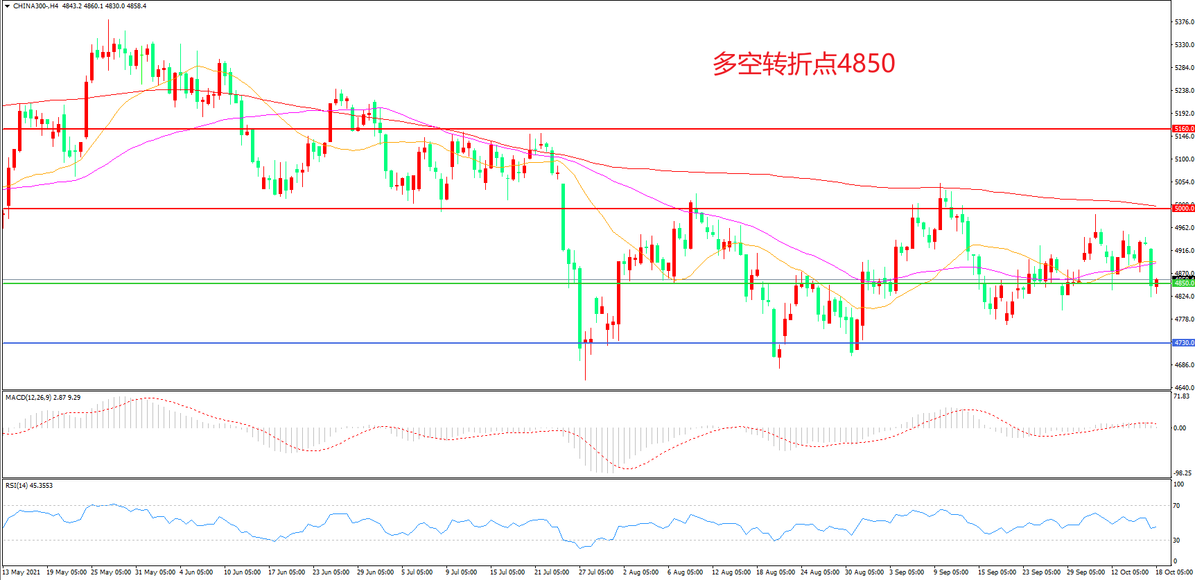 4小时图看,沪深300长阴下破,呈现弱势震荡形态,5000点成为上方阻力,4850成为下方支撑,MACD红柱缩短,RSI指标走平,日内延续震荡概率较大。