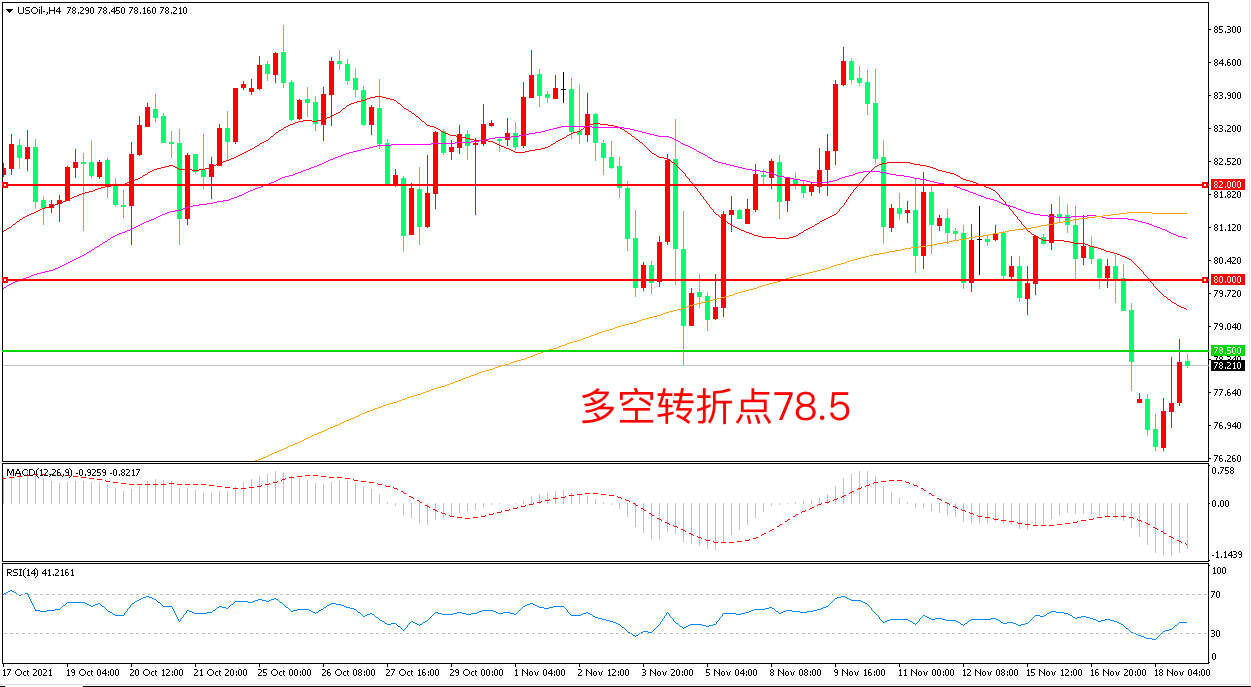 交易策略:在78.50之下看跌,目标76.00               74.00