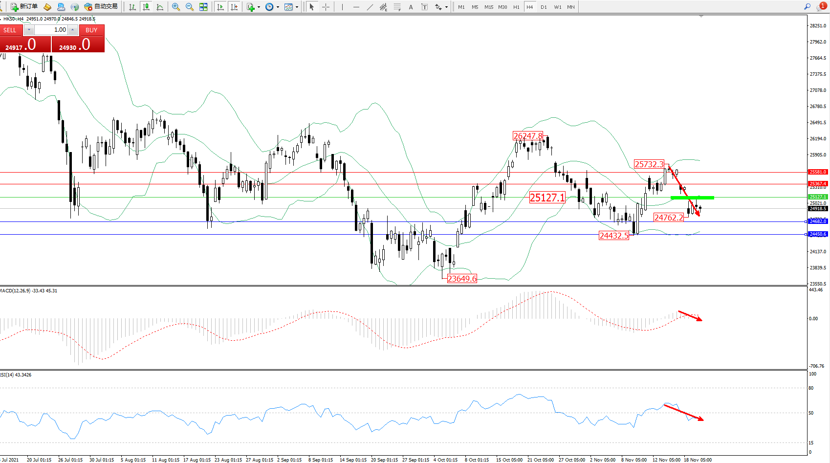 香港恒生指数11月22日(周一)收盘下跌98.63点,跌幅0.39%,报24951.34点;港股大市疲弱,尾盘略有回升,但三大指数最终均收跌。恒生科技指数跌0.73%报6410点。大型科技股普跌,快手、美团、百度跌超2%,阿里巴巴、小米跌超1%。在线教育股全天强势领涨,新东方在线大涨23%,恒大概念股尾盘异动拉升,恒腾网络直线飙涨超27%,恒大汽车涨11%;苹果概念股继续强势,舜宇、瑞声皆走强,高伟电子再创新高价,月内飙升70%。今日大市成交额为1292亿港元,南下资金净流出4.05亿港元。