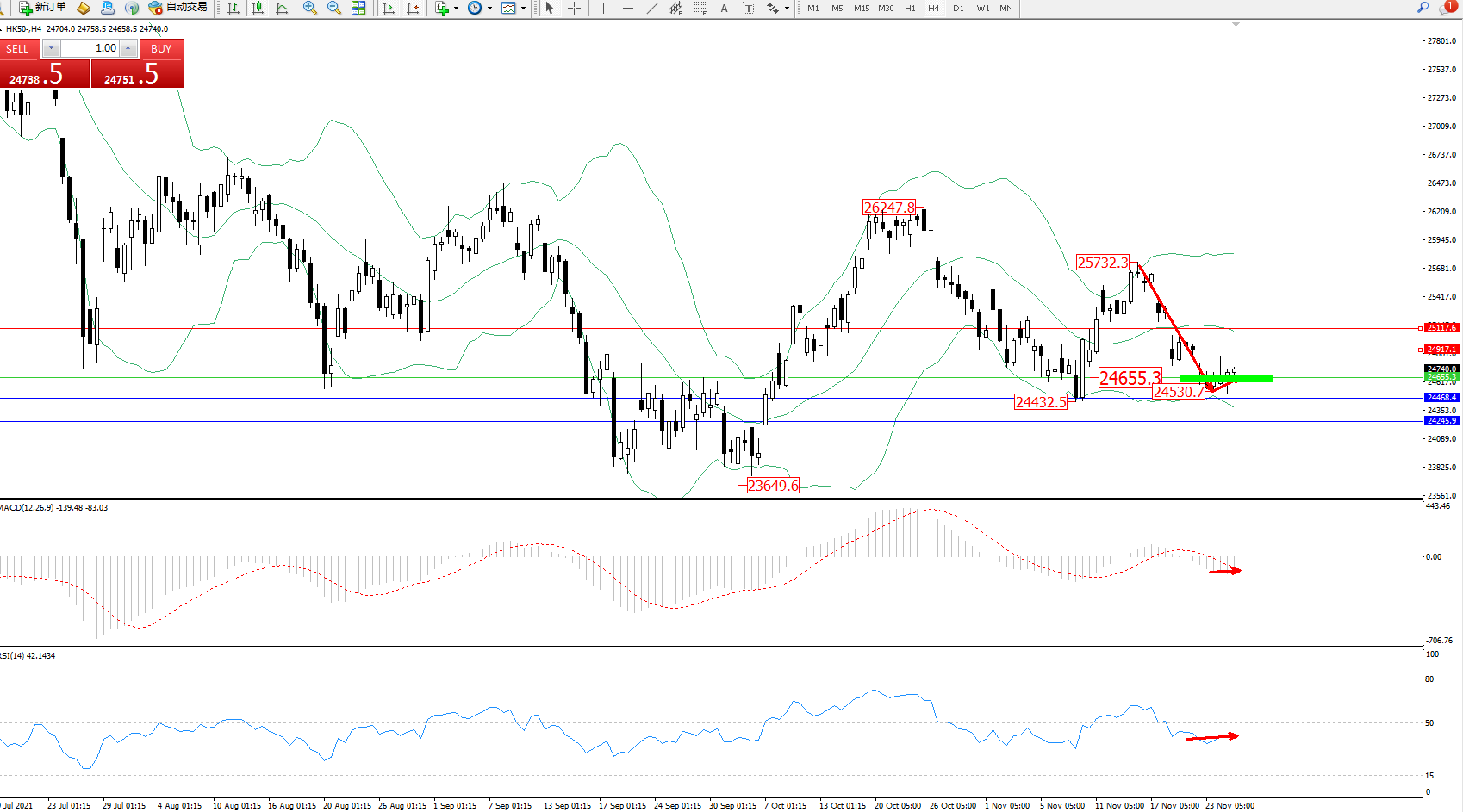 技术点评:空头动力持续震荡下行,低位抵达24530位置后开始短暂整理回升,布林带指标呈缓慢张口走势中,短期多头动力有回升迹象,MACD指标处于0轴线下方空头区域维持整理平移,RSI指标处于50均衡线下方空头区域弱势徘徊;
