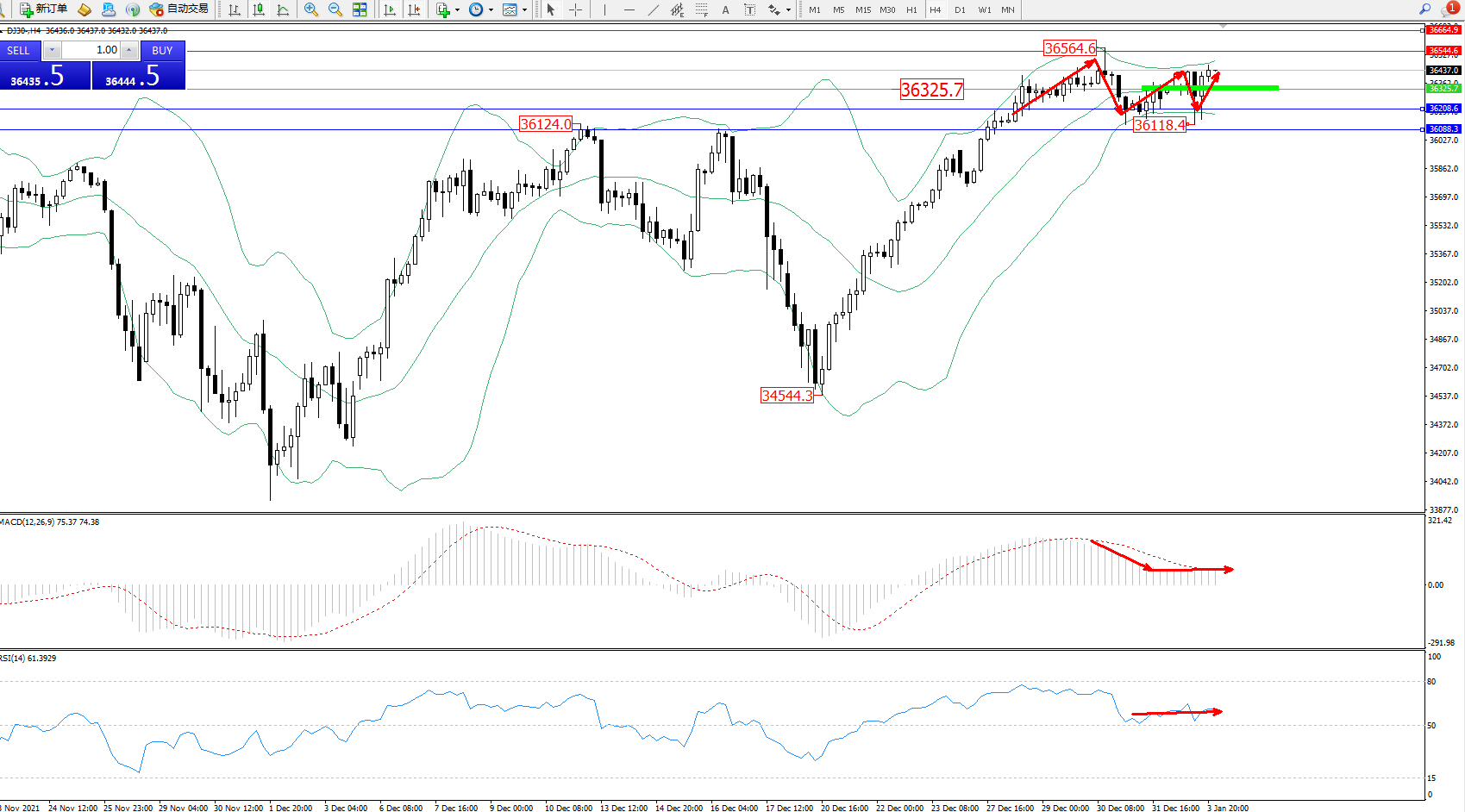 技术点评:多头动力延续布林带指标通道中上轨区间持续震荡上扬,高位抵达36564位置后遇阻震荡,短期布林带指标呈收口走势平移后有缓慢张口迹象,MACD指标处于0轴线上方弱势徘徊中,RSI指标处于50均衡线上方持续震荡中;