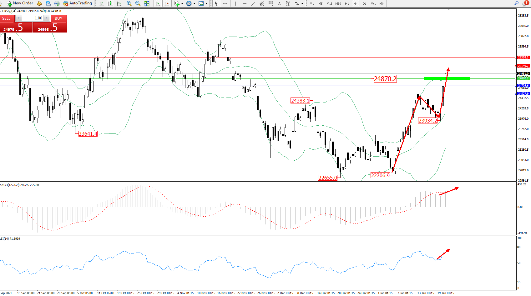香港恒生指数1月20日(周四)收盘上涨824.5点,涨幅3.42%,报24952.35点;港股今日大幅拉升反弹,三大指数均呈高开高走行情,恒生科技指数涨4.5%。南下资金大幅净流入73.18亿港元,大市成交额放大至1783亿港元。大型科技股大涨,美团劲升11%,腾讯、京东、百度、快手均涨超6%,阿里巴巴、小米等皆有涨幅;央行超预期降息,内房股与物管股再度活跃,在今天商务部举行的例行新闻发布会上,有媒体问,美国时间的周三,拜登在发布会上表示他还没有准备好取消他前任加征的关税,请问商务部有何评论?对此,商务部新闻发言人束珏婷表示,中方始终认为,取消加征关税有利于中国,有利于美国,有利于世界。特别是在当前通胀形势下,取消加征关税符合中美两国消费者和生产者的根本利益,有利于世界经济恢复。