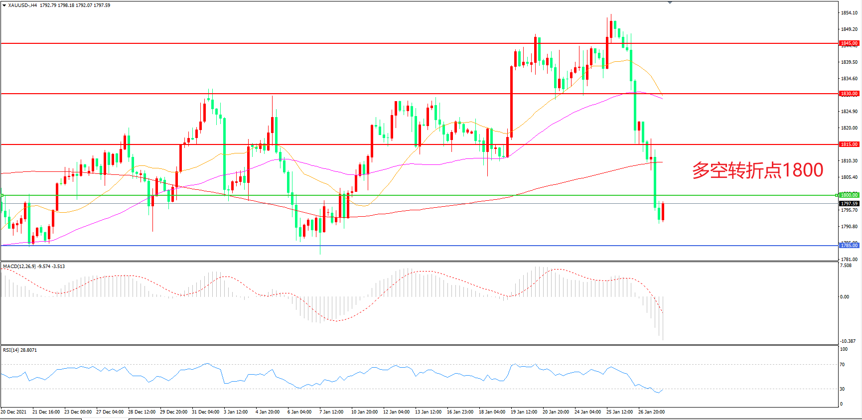 周四(1月27日),美联储议息会议暗示3月加息、并表示不排除每次议息会议都加息的可能性,其鹰派程度超出市场预期,美元大幅飙升,现货黄金抹去前期全部涨幅,收报1797.35美元/盎司。目前的下跌是周三抛盘的延续,市场正在进一步消化美联储主席鲍威尔关于加息的言论,短期金价延续下行概率较大。
