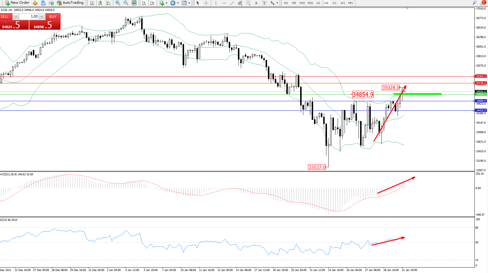道琼斯指数DJ30——4小时K线图显示: