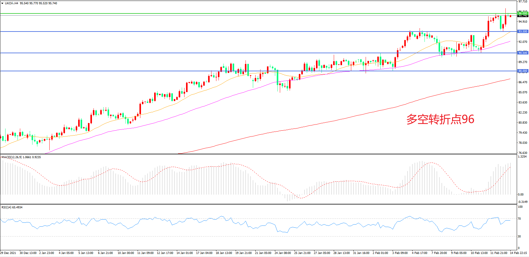 周一(2月14日),俄乌局势持续紧张,战争阴霾笼罩导致油价走势偏强,布伦特原油延续强势表现,收报95.71美元/桶。俄乌爆发武装冲突可能引发欧美制裁俄罗斯,破坏俄罗斯作为原油超级大国超级大国的出口,在库存很低且闲置产能进一步减少的当下会扰乱供应端,短期内油价延续强势概率较大。