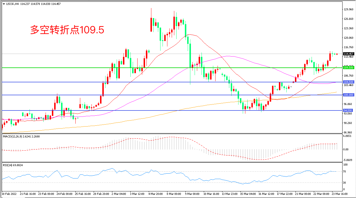 周三(3月23日),乌克兰谈判代表周三称俄乌谈判遇到“重大困难”而里海因罕见的风暴破坏,已暂停向管道输油,原油供应可能会减少多达100万桶/天,占全球原油产量的1%。,美国WTI原油大幅拉升,收报114.48美元/桶。今晚拜登将参加北约特别峰会和欧洲理事会峰会,届时可能会宣布对俄罗斯实施更多的制裁,如果俄乌局势进一步恶化,油价可能还会飙升。