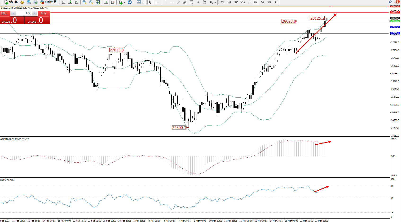 日经225指数3月24日(周四)收盘上涨62.84点,涨幅0.22%,报28103.00点。罗斯入侵乌克兰将拖累全球经济增长,并加剧日本经济复苏的风险,这突显即使通胀率上升,也需要保持超宽松的货币政策。日本央行审议委员片冈刚士称,虽然消费者通胀率可能会短暂超过1.5%,但可能不会获得持续向央行2%的目标推进的动力。片冈刚士一直是加大货币刺激的唯一支持者。然支持经济仍然是比抗击通胀更重要的优先事项,但日本央行的决策者们在俄罗斯2月24日入侵乌克兰之前,就已更加关注通胀压力的上升。