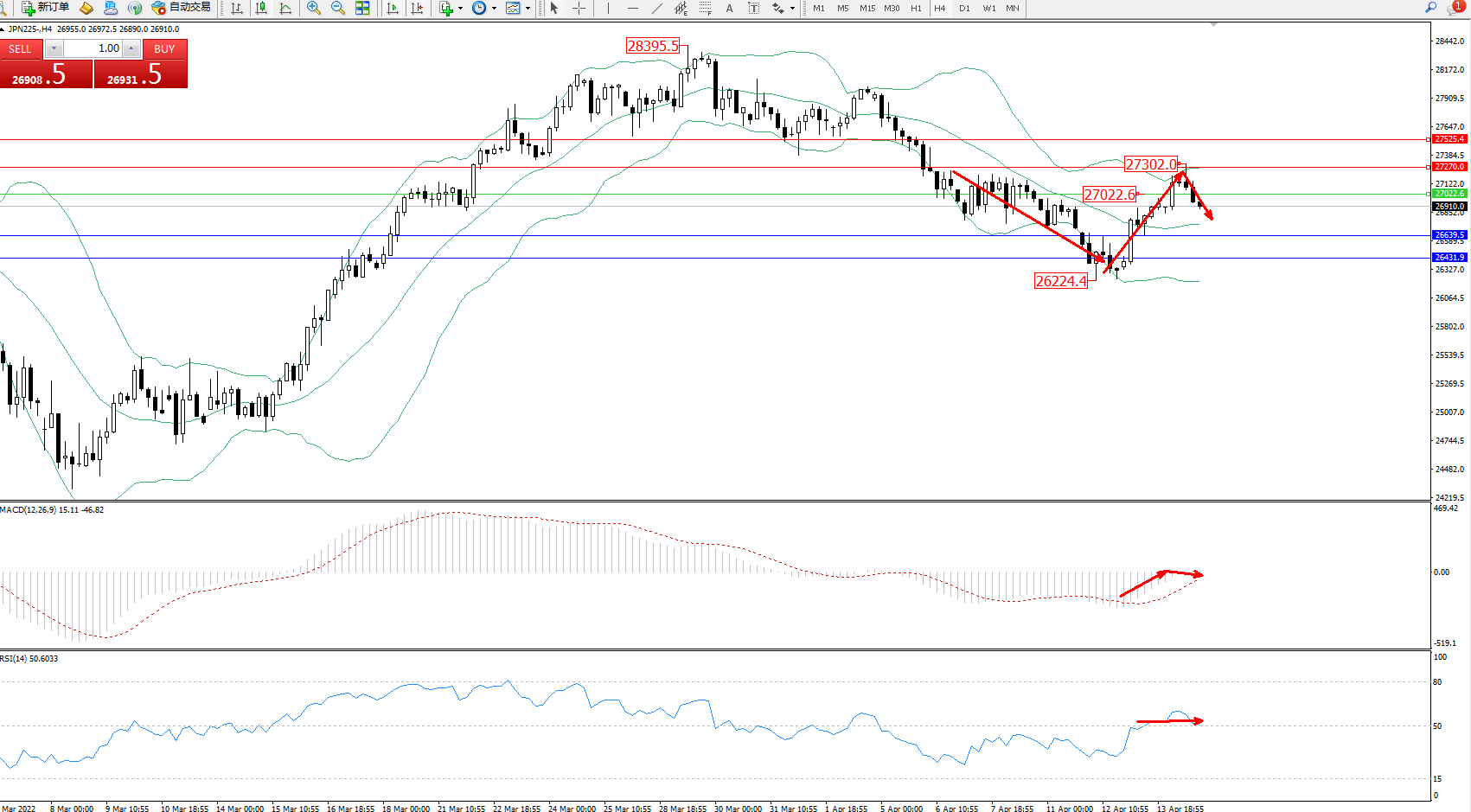 技术点评:空头力度延续布林带指标通道中下轨区间持续震荡下行,低位抵达26224位置后开始震荡上扬,触及布林带指标上轨27302位置附近遇阻下行,短期空头动力有继续下行态势,布林带指标呈缓慢张口走势平移中,MACD指标处于空头区域维持震荡上移至0轴线附近弱势徘徊中,RSI指标处于50均衡在线侧弱势整理;