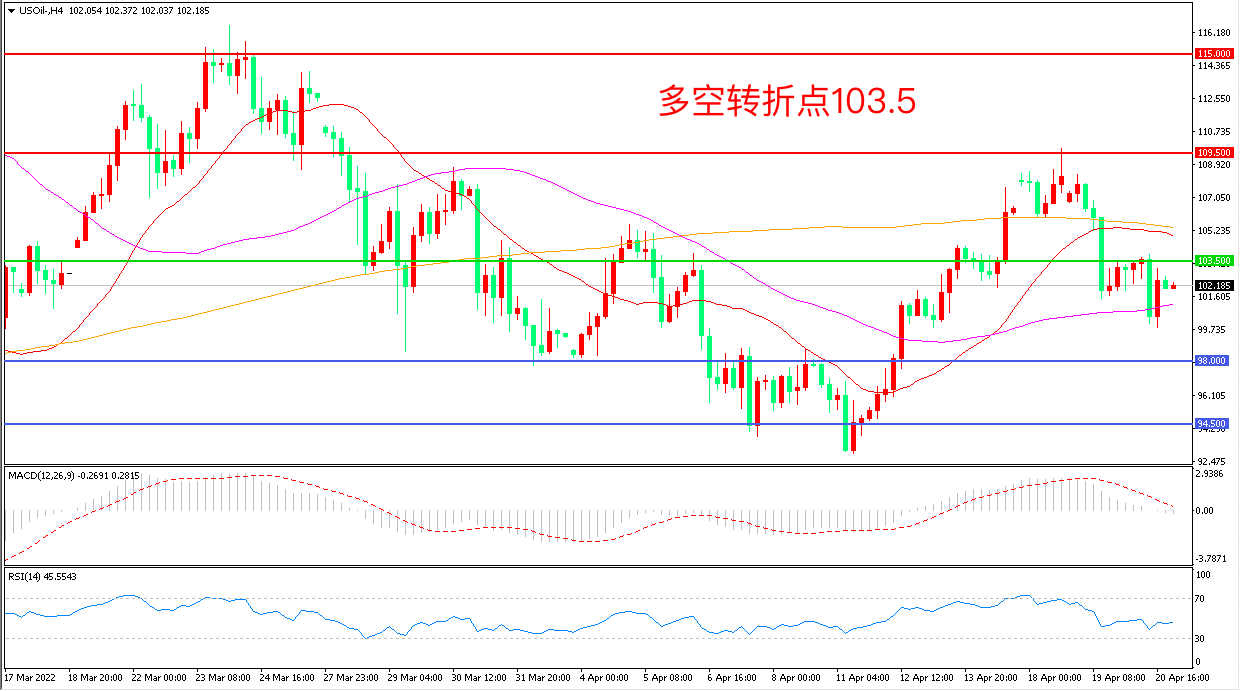 周三(4月20日),油价全球经济增速被下调和需求疲软的“拉锯战”之间波动不安,,美国WTI原油宽幅震荡后,收报102.15/桶。据称,欧盟将在本周末的法国大选后,宣布对俄罗斯石油实行全面禁运,如果制裁再进一步,有可能导致油价再度飙升,另外本周日法国大选结果也会对短期行情形成冲击,务必重点关注。