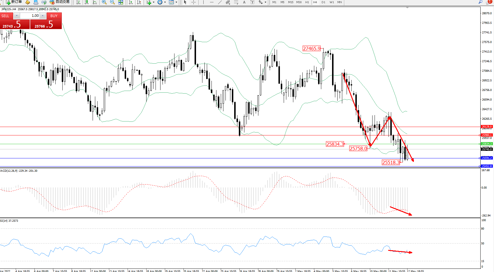 技术点评:空头动力延续布林带指标通道中下轨区间持续震荡下行,低位抵达25518附近节点后开始震荡,短期空头动力有继续下行态势,布林带指标呈空头动力不断震荡下挫后低位开始整理平移,MACD指标处于空头区域低位维持整理平移,RSI指标处于空头区域维持弱势徘徊中;