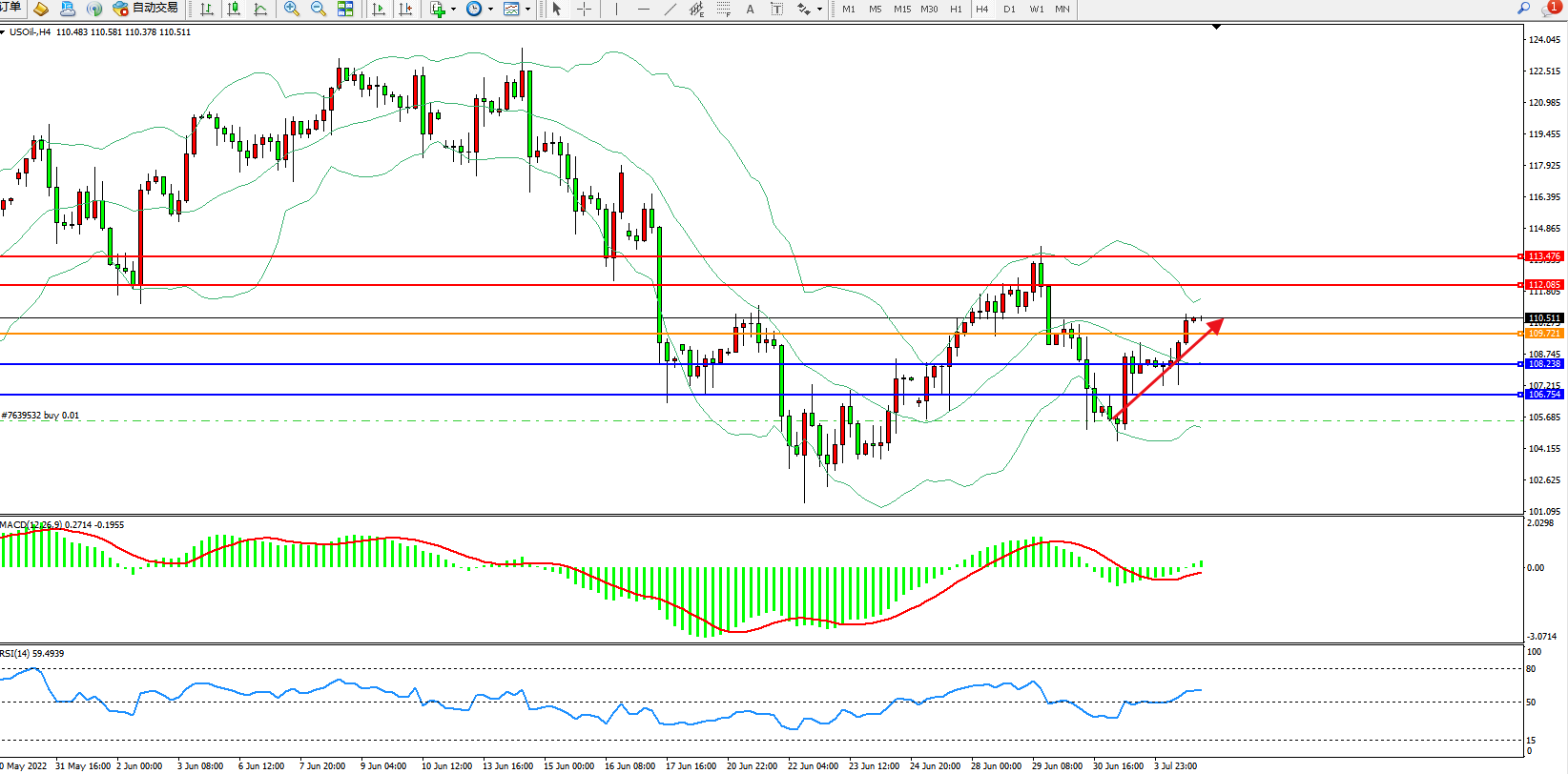4小时图看:多头动力维持震荡上扬,即将触及布林带指标上轨附近节点,布林带指标呈收口走势持续中,MACD指标处于0轴线上側徘徊,RSI指标处于50均衡线上側窄幅整理;