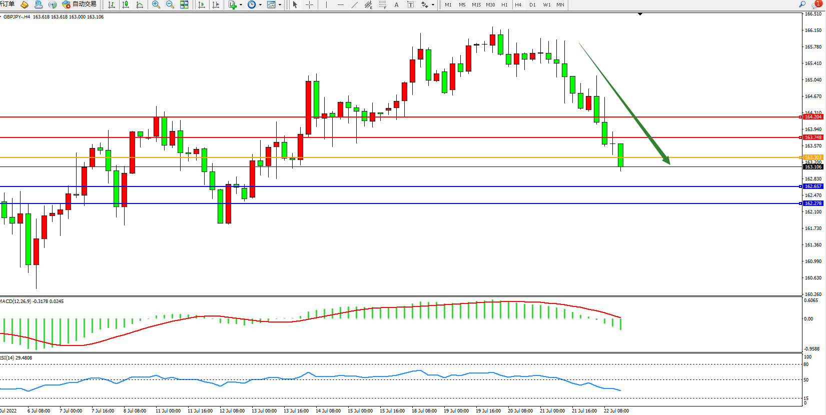 4小时图看:空头动力下行态势了,短期未见有止步迹象,MACD指标处于0轴线下侧徘徊中,RSI指标处于空头区域维持弱势整理缓慢下移;