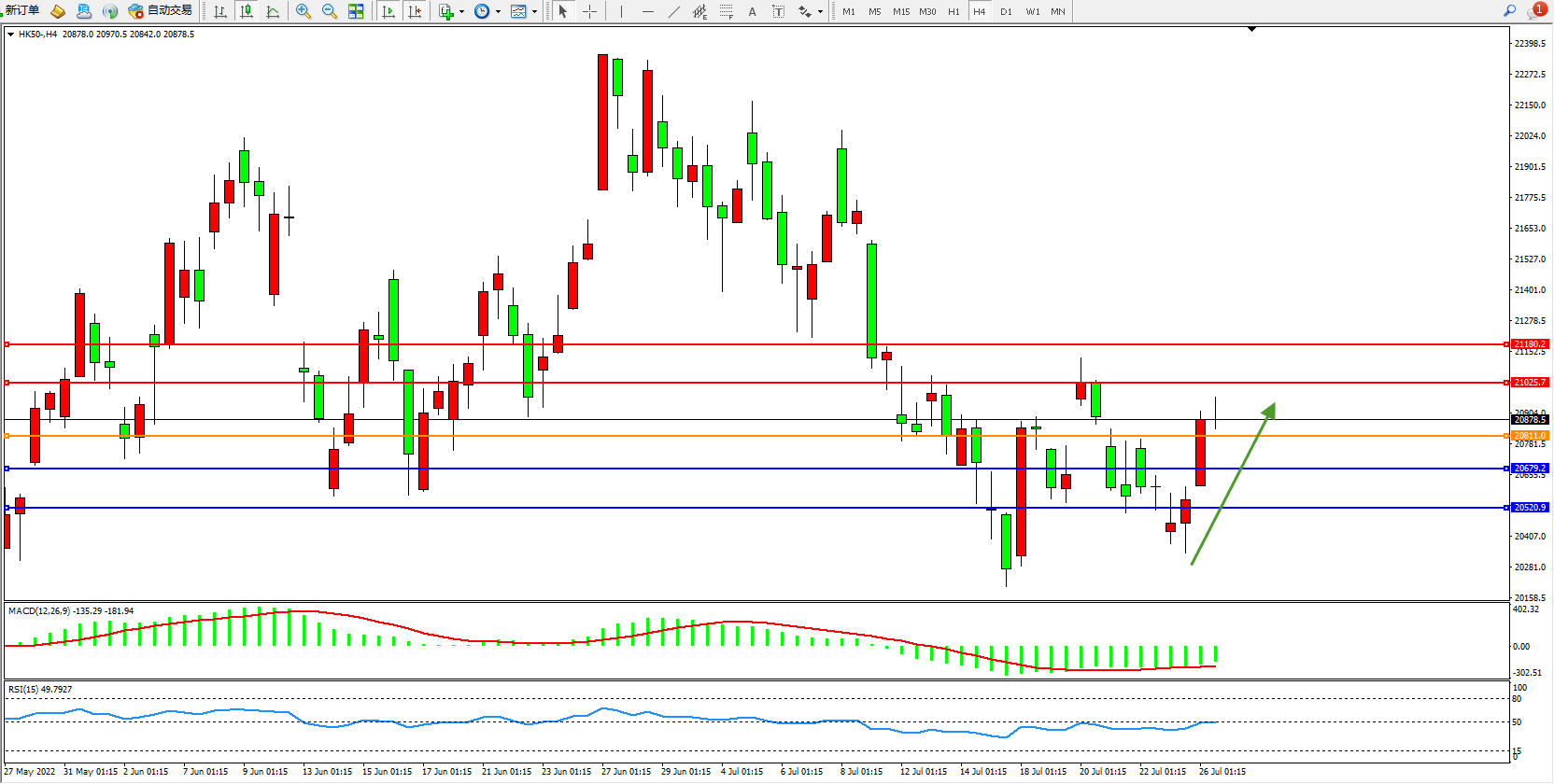 香港恒生指数7月26日(周二)收盘上涨342.94点,涨幅1.67%,报20905.88点;港股反弹,三大指数均收涨。教育股、内房股与物管股尾盘涨幅加大,为市场表现最佳。新东方在线大幅收涨超19%领衔教育股走高,纾困项目对接商洽会召开,内房股与物管股齐飞;今日南下资金净流入21.85亿港元,大市成交额为965亿港元。