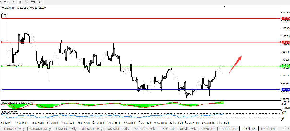 4小时图看:油价持续小幅反弹, MACD量能柱0轴上方持续放量,RSI指标持续偏强,短期价格延续反弹概率较大,中期依旧不容乐观。