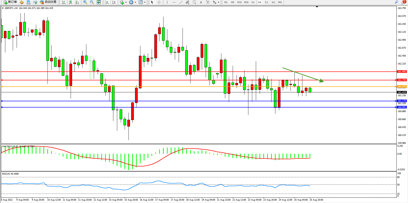 4小时图看:短期空头动力维持宽幅震荡缓慢下行,市场整体依旧偏弱势,MACD指标处于0轴线下侧窄幅整理,RSI指标处于50均衡线下侧徘徊;
