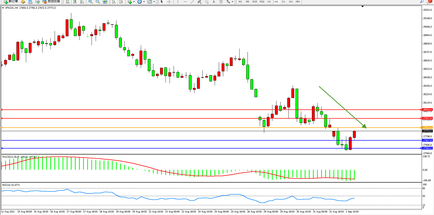 日经225指数9月1日(周四)收盘下跌435.03点,跌幅1.55%,报27656.50点。日本企业4-6月连续第五个季度增加工厂和设备支出,尽管成本上升、疫情和供应链中断,但企业信心仍然很有韧性。