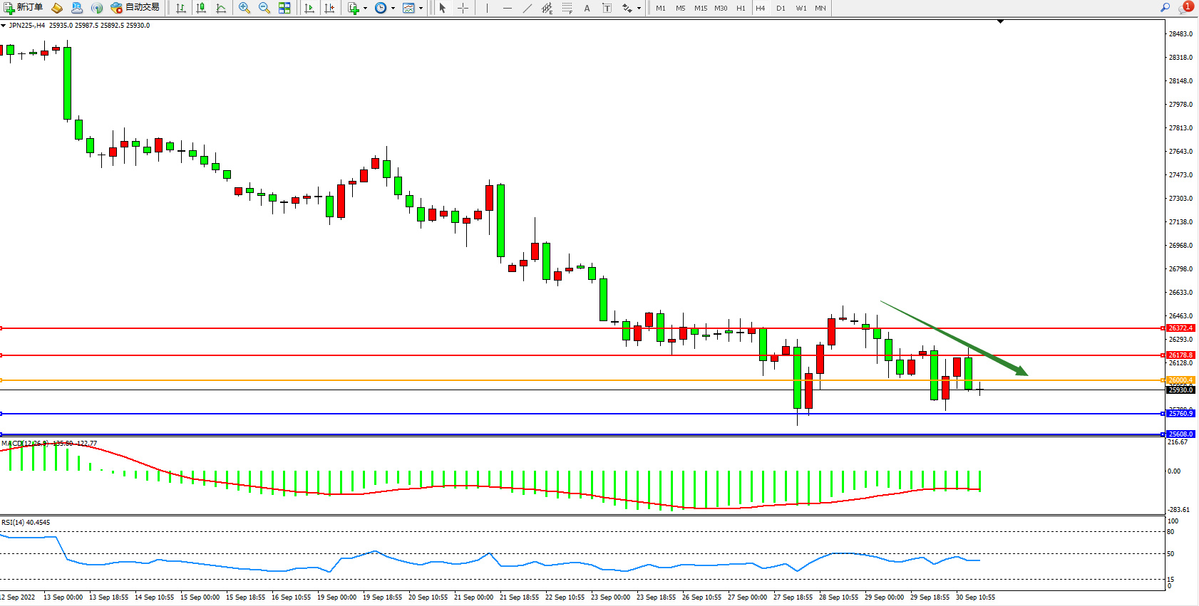 日经225指数9月30日(周五)收盘下跌552.55点,跌幅2.09%,报25869.50点。日经225 9月累跌7.91%,刷新2020年3月来记录。日本8月新屋开工同比增长4.6%,而市场预期为下降4.1%;有报道称,东京将于10月20日加入全国旅行补贴计划;日本政府官员称,由于对智能手机和个人电脑的需求下降,芯片产量受到内存产量下降的严重影响。