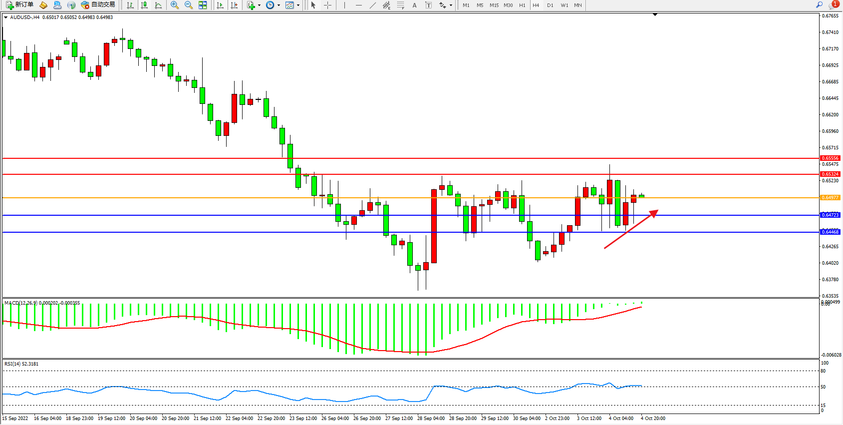 澳元兑美元维持0.64977附近震荡,澳大利亚至10月4日澳洲联储利率决定 2.6%,预期2.85%,前值2.35%。澳洲联储加息25个基点%,加息幅度有所回落且小于市场预期。