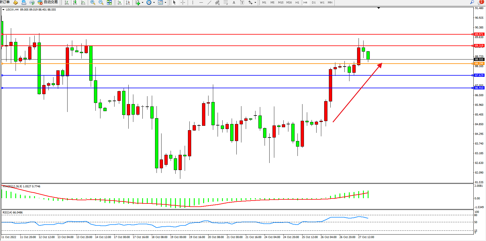 原油维持88.555附近震荡,世界银行表示,在俄罗斯入侵乌克兰后导致油价飙升60%之后,预计2023年能源价格将下跌11%。全球经济增长放缓可能放大跌幅。
