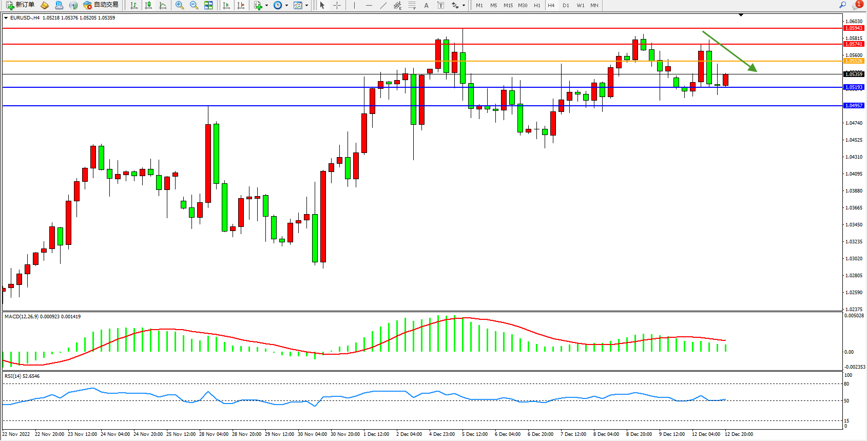 欧元美元EURUSD—4小时K线图显示: