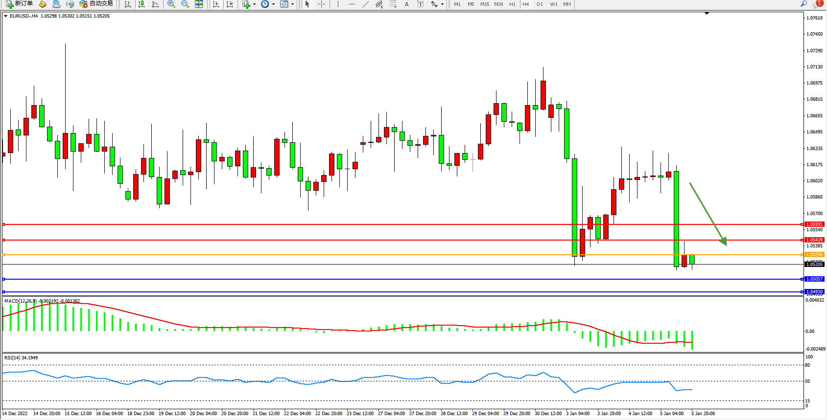 欧元美元EURUSD—4小时K线图显示: